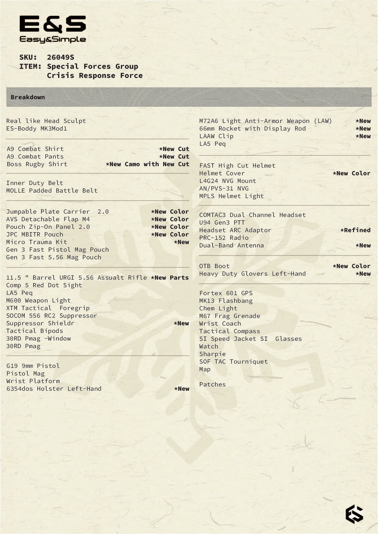 For sale is a brand new 1:6 scale "Special Forces Group Crisis Response Group SPECIAL VERSION" by Easy & Simple (26049S). This is a highly detailed and collectible 12" tall action figure like G.I. Joe, Dragon, BBI, Hot Toys, Soldier Story, Crazy Dummy, and DAM Toys in excellent new in box / never removed from box condition.
