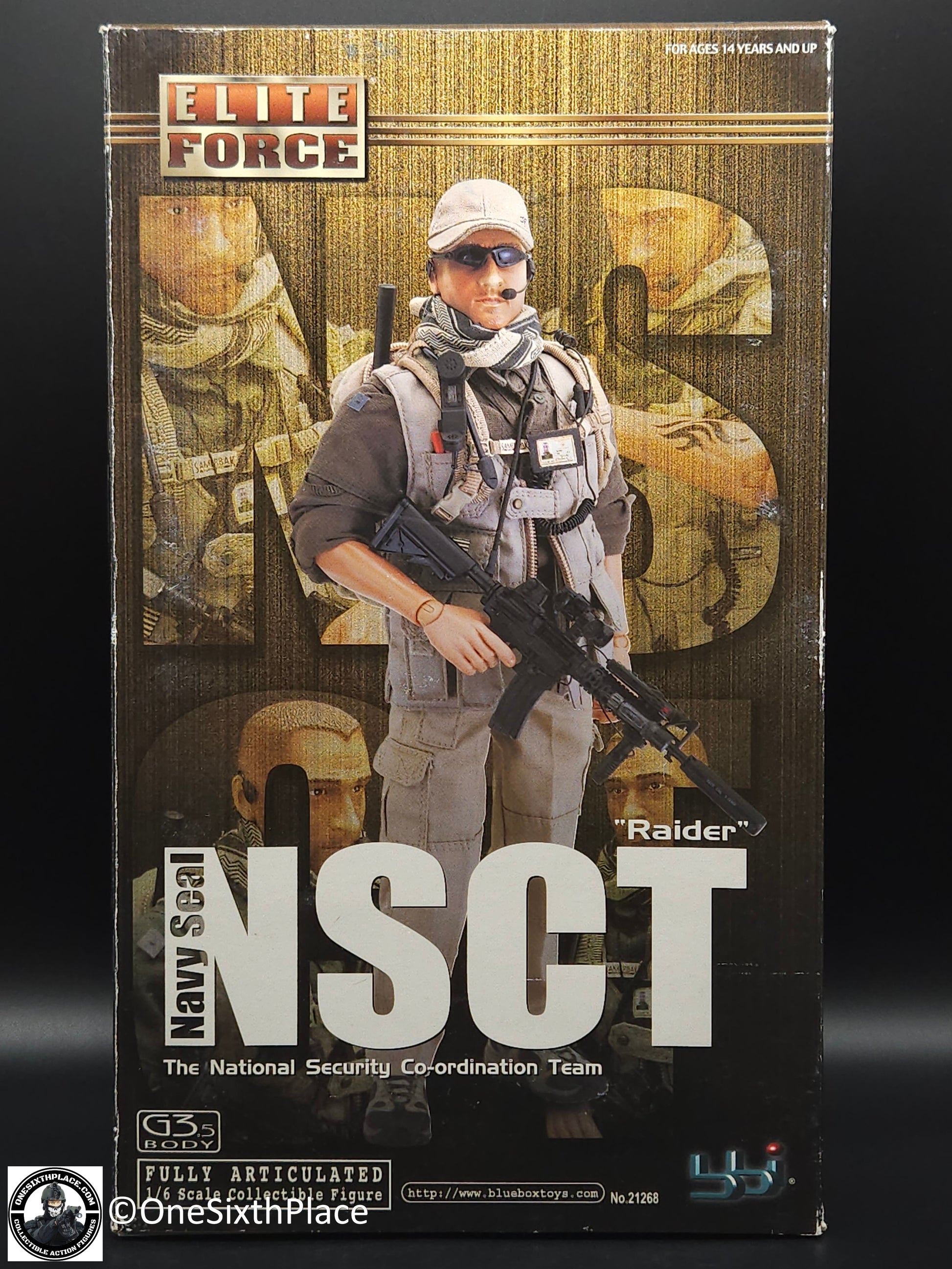 For sale is a new 1:6 scale "Elite Force Navy SEAL National Security Co-ordination Team (NSCT) Raider" figure by Blue Box International (No. 21107. This is a collectible 12" action figure set like G.I. Joe, Dragon, BBI, Hot Toys, Soldier Story, Crazy Dummy, and DAM Toys in Never-Removed-From-Box condition. Recommended for ages 14 and up.
