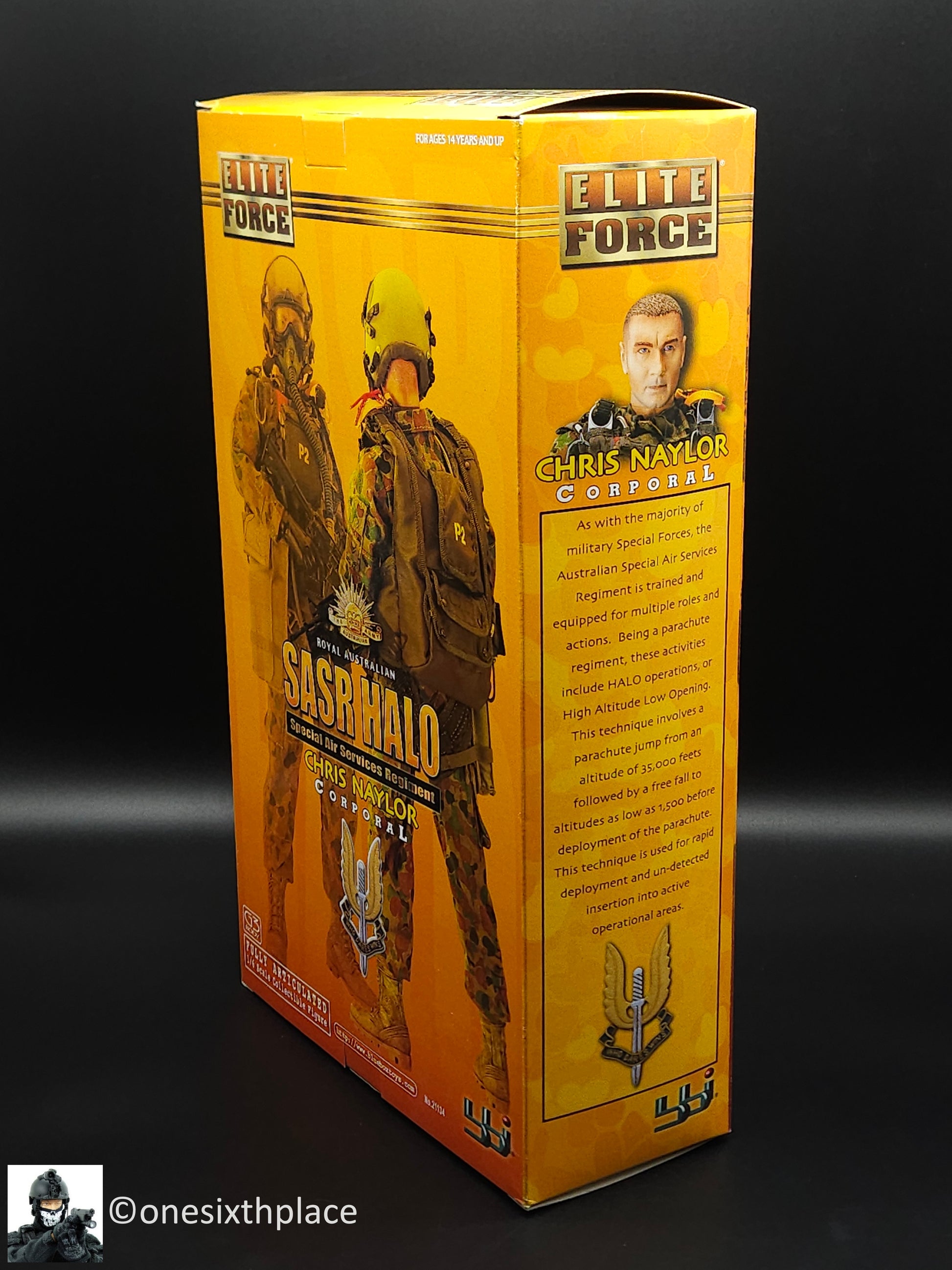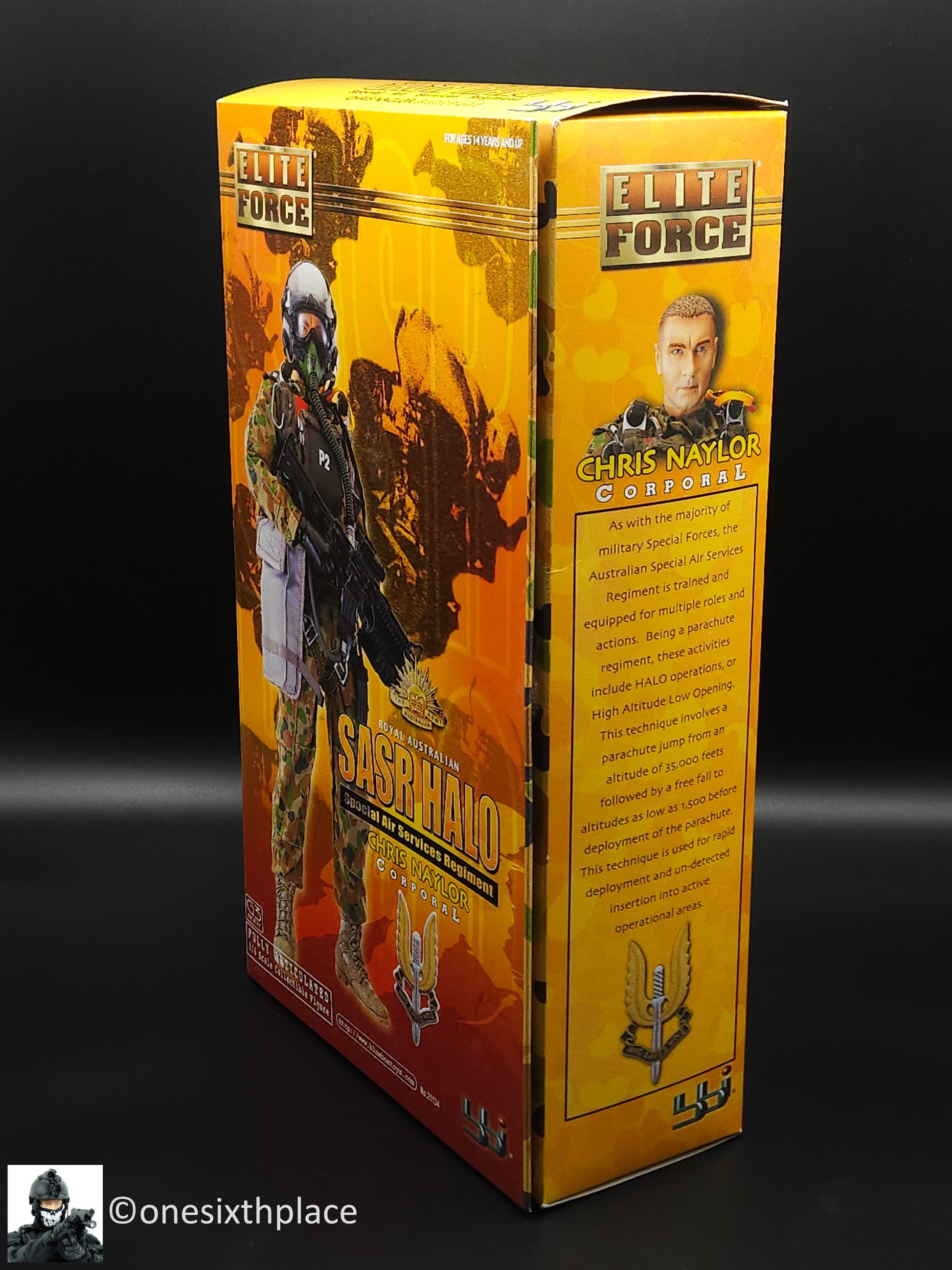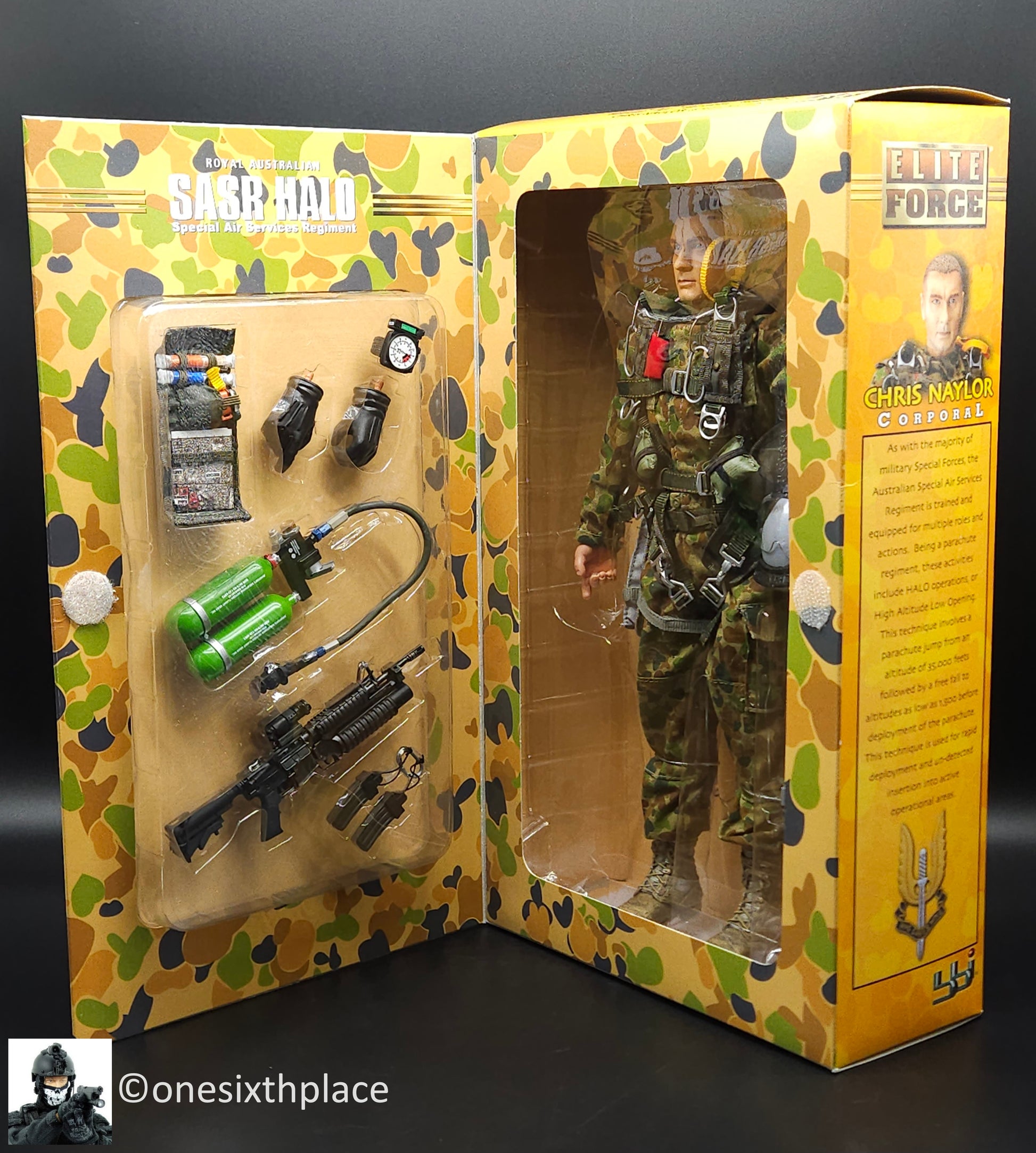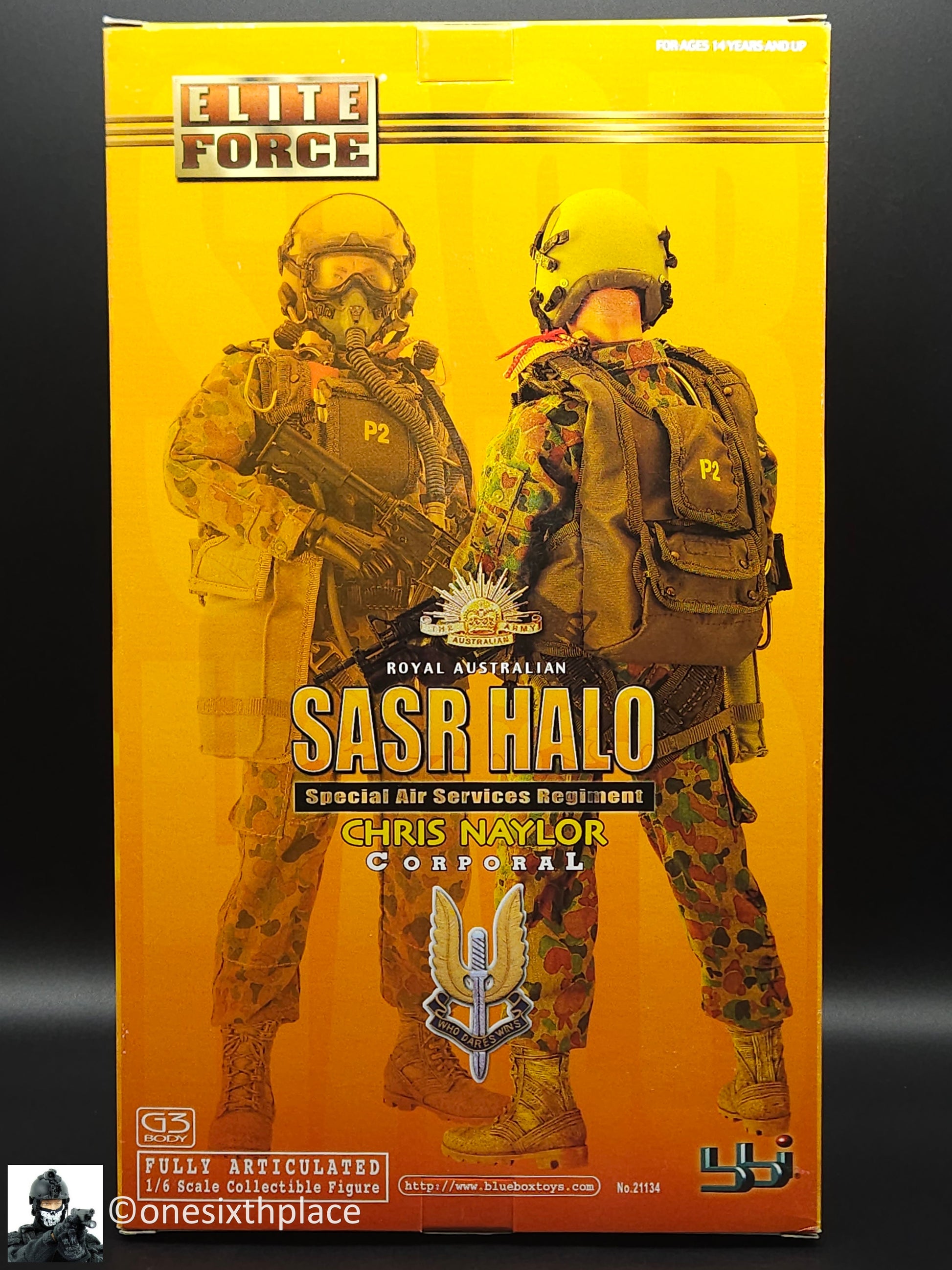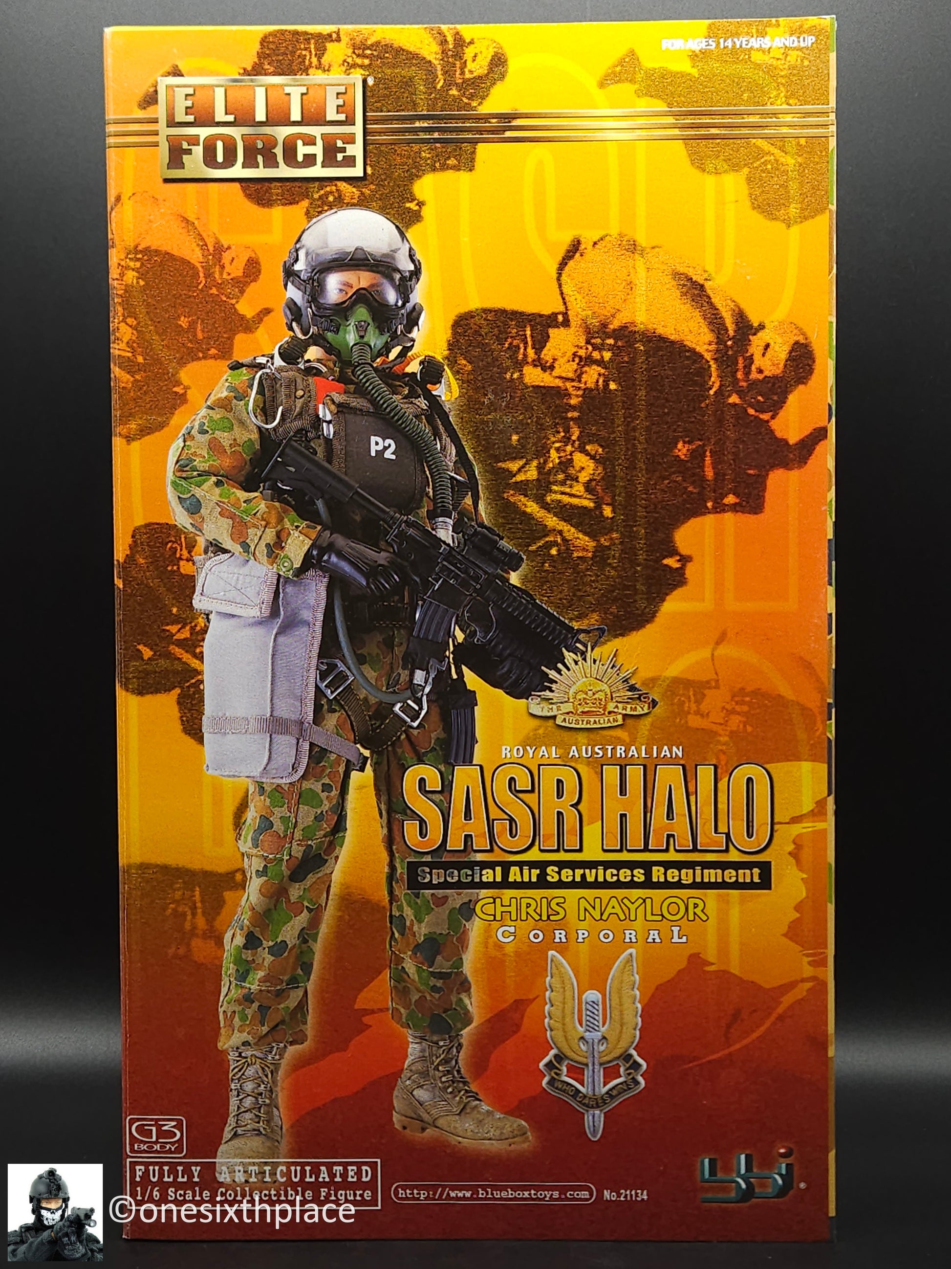 For sale is a new 1:6 scale "Elite Force Royal Australian Special Air Services Regiment (SASR) HALO Corporal Chris Naylor" figure by Blue Box International (No. 21134). This is a collectible 12" action figure set like G.I. Joe, Dragon, BBI, Hot Toys, Soldier Story, Crazy Dummy, and DAM Toys in Never-Removed-From-Box condition. Recommended for ages 14 and up.