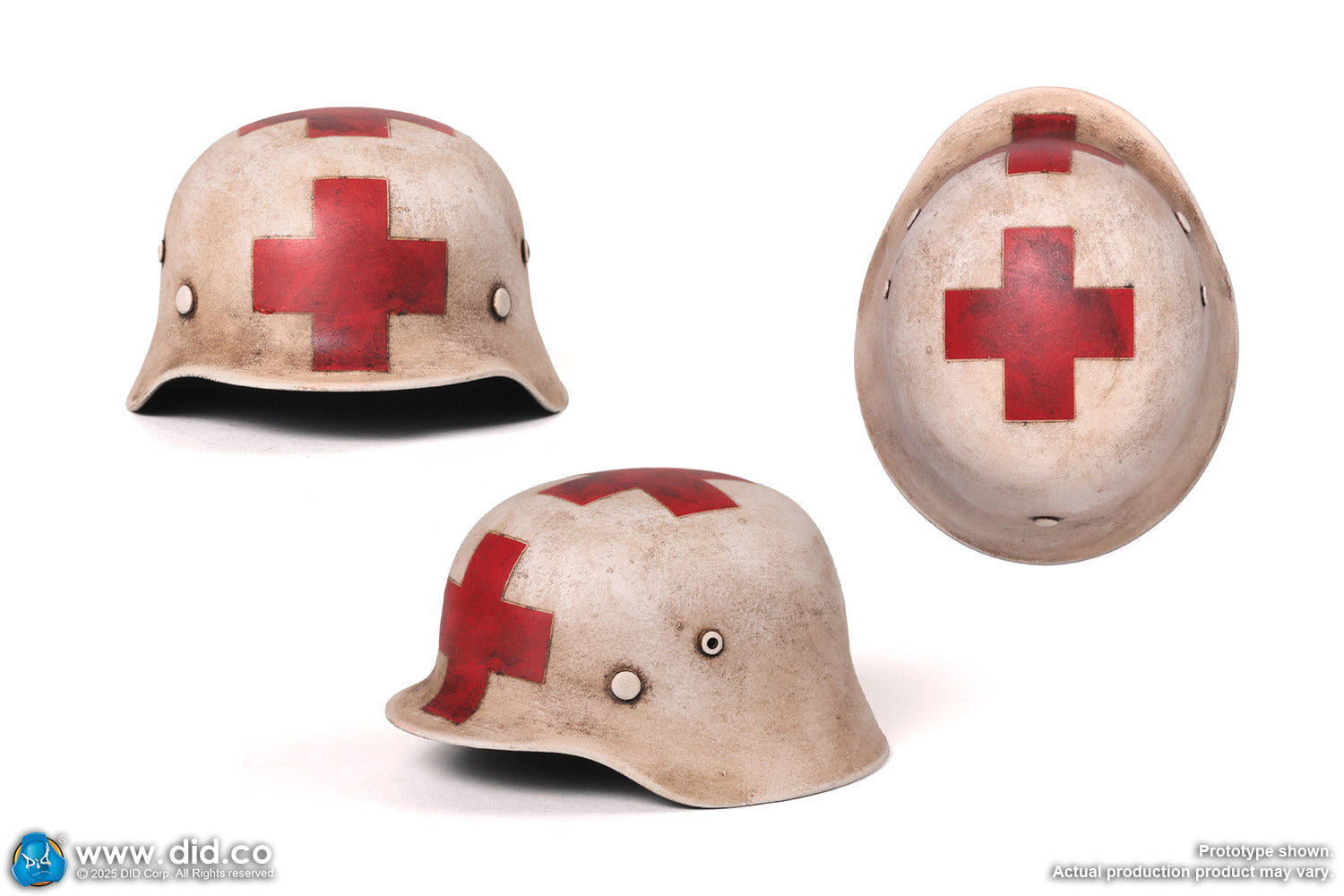 - Medical NCO visor cap and German medic helmet (metal with weathering) with inner liner.